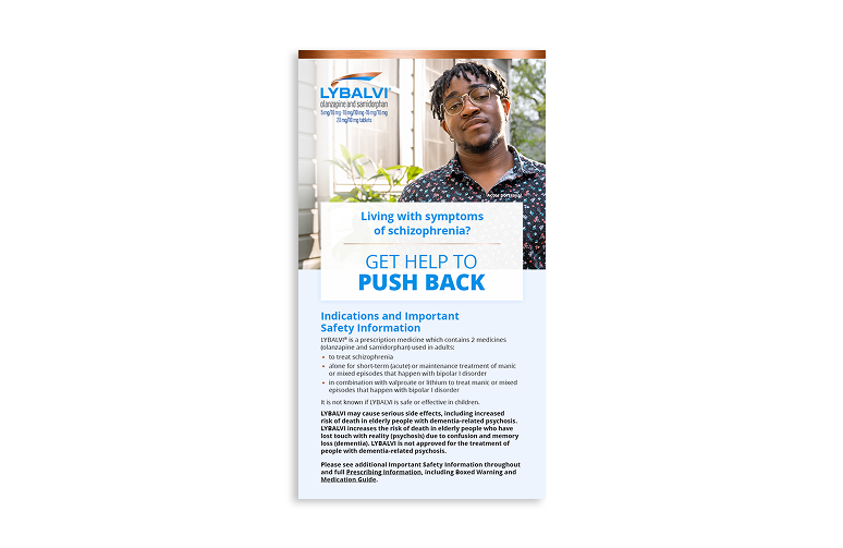 LYBALVI may cause serious side effects, including increased risk of death in elderly people with dementia-related psychosis. LYBALVI increases the risk of death in elderly people who have lost touch with reality (psychosis) due to confusion and memory loss (dementia). LYBALVI is not approved for the treatment of people with dementia-related psychosis.